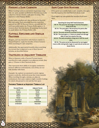 This single-page document is an additional rule you can use in your home games for DnD 5e (2014). This document provides rules that allow the party to search for a safe spot to camp while outdoors, which could grant the party minor buffs for their next day.